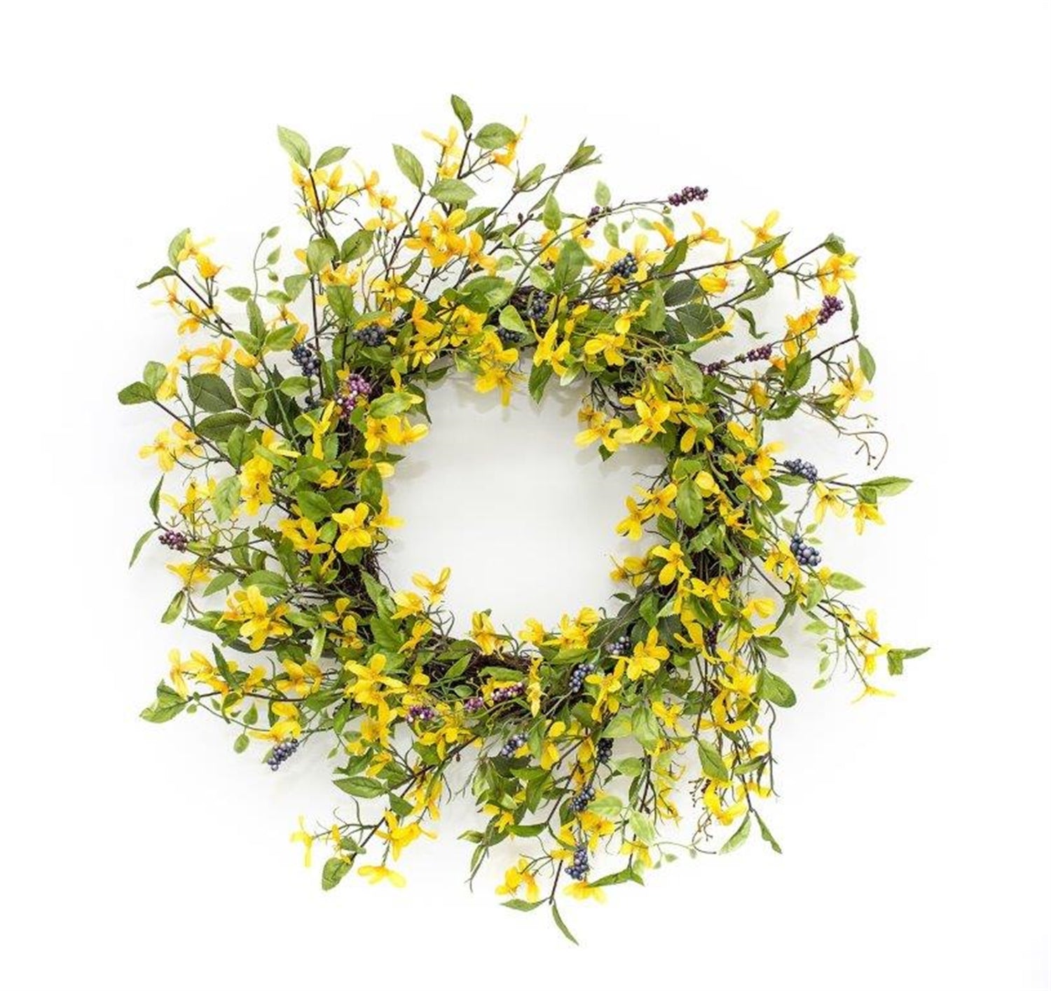 Welcome your guests this spring with a beautiful Mixed Floral Wreath. Perfect for hanging on your front door or in your entryway, this piece is sure to add interest to your space. The yellow forsythia flowers paired with the assorted foliage leaves is the perfect combination to create a stunning spring display. The natural twig base gives the piece additional depth and color. The quality polyester leaves are sure to last for seasons to come. Measures 27.25 x 30 x 27.5. Primary Materials: Polyester. Reccommended for indoor and outdoor covered use only. Shop Home Décor & More from Diana Dreger Designs.