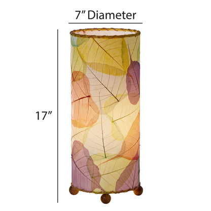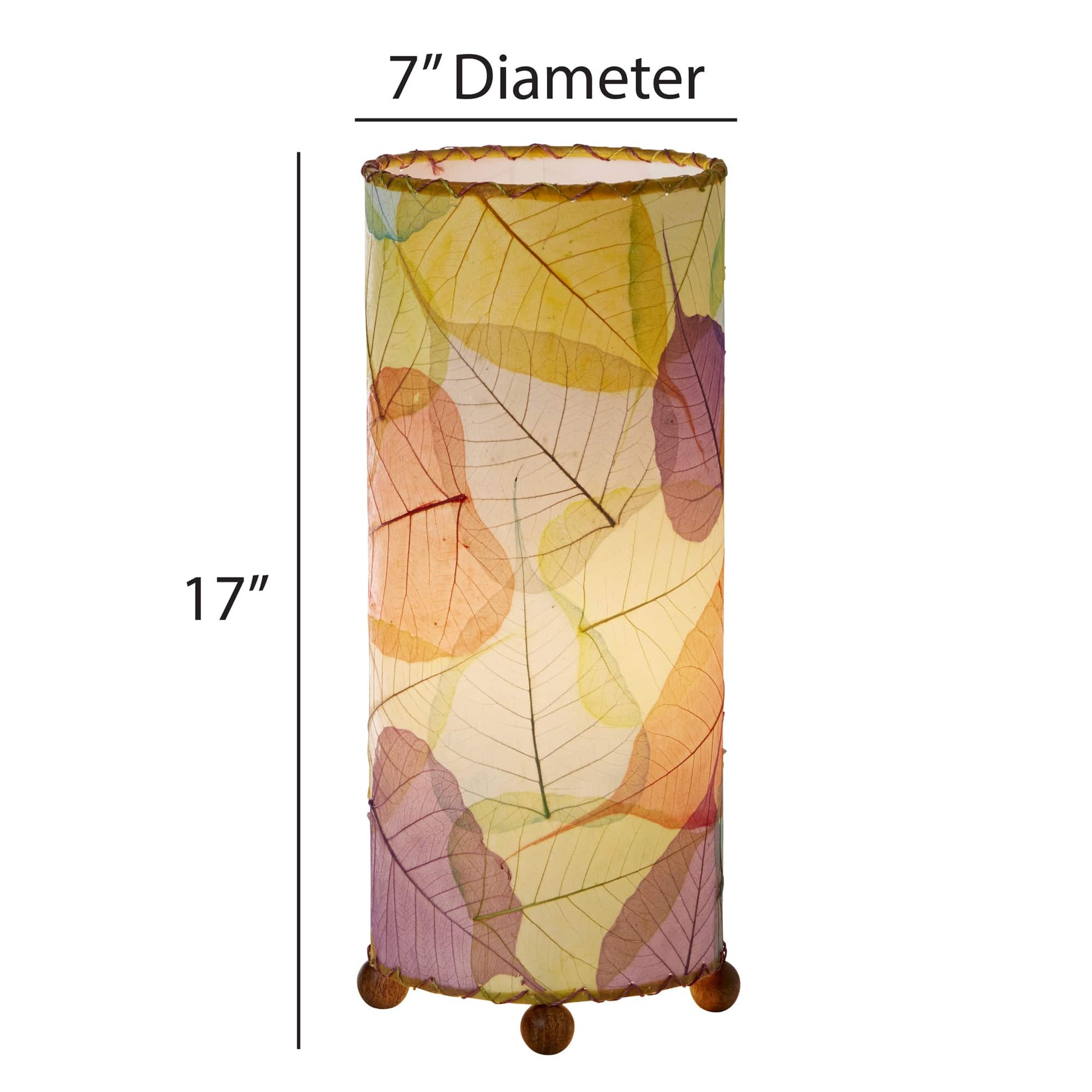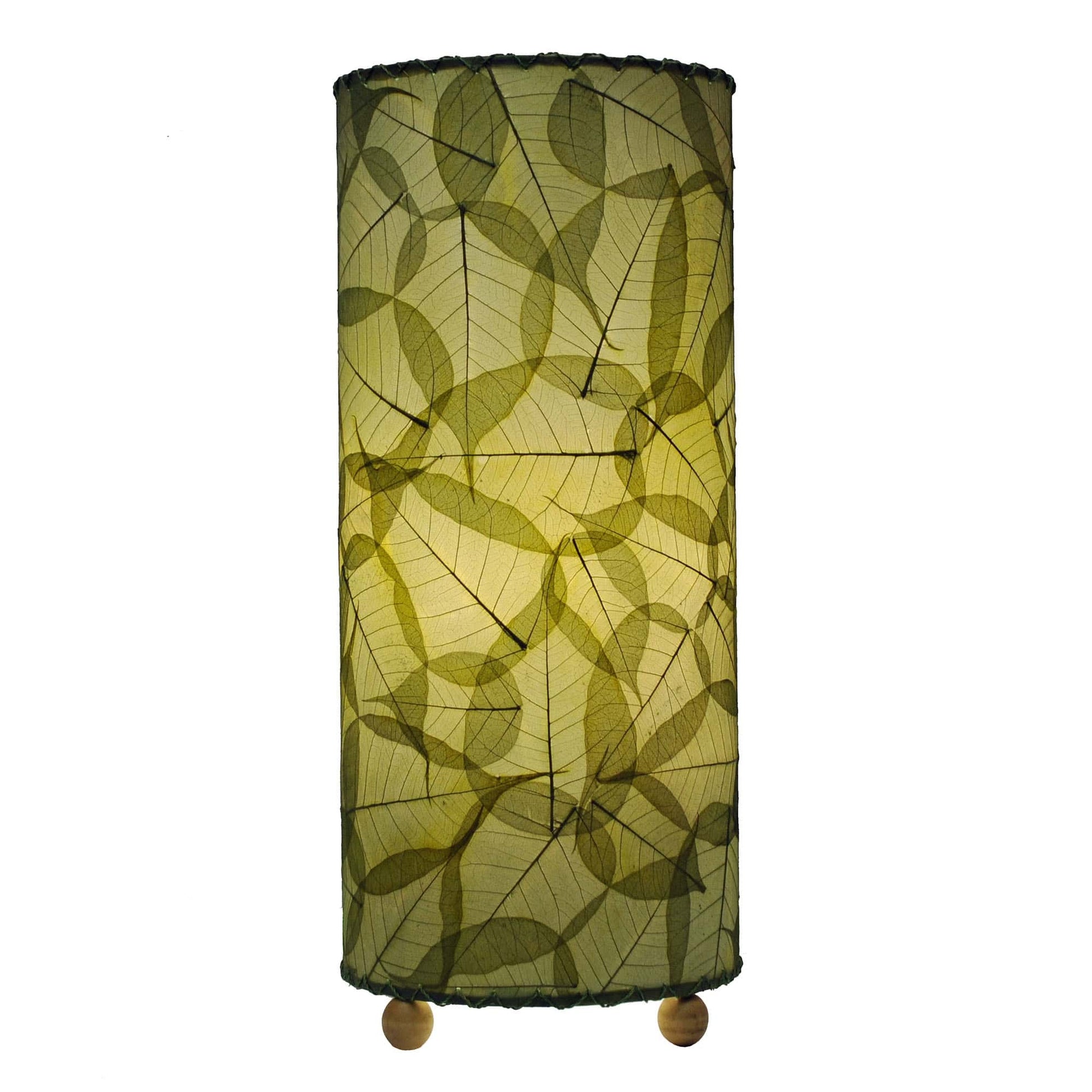 Features overlapping fossilized banyan leaves that are hand placed onto a standard UL lampshade backing using a non-toxic adhesive, laminated and formed into a cylinder shape. The shade is handstitched onto a powder coated, wrought iron frame and uses wooden finials as feet.