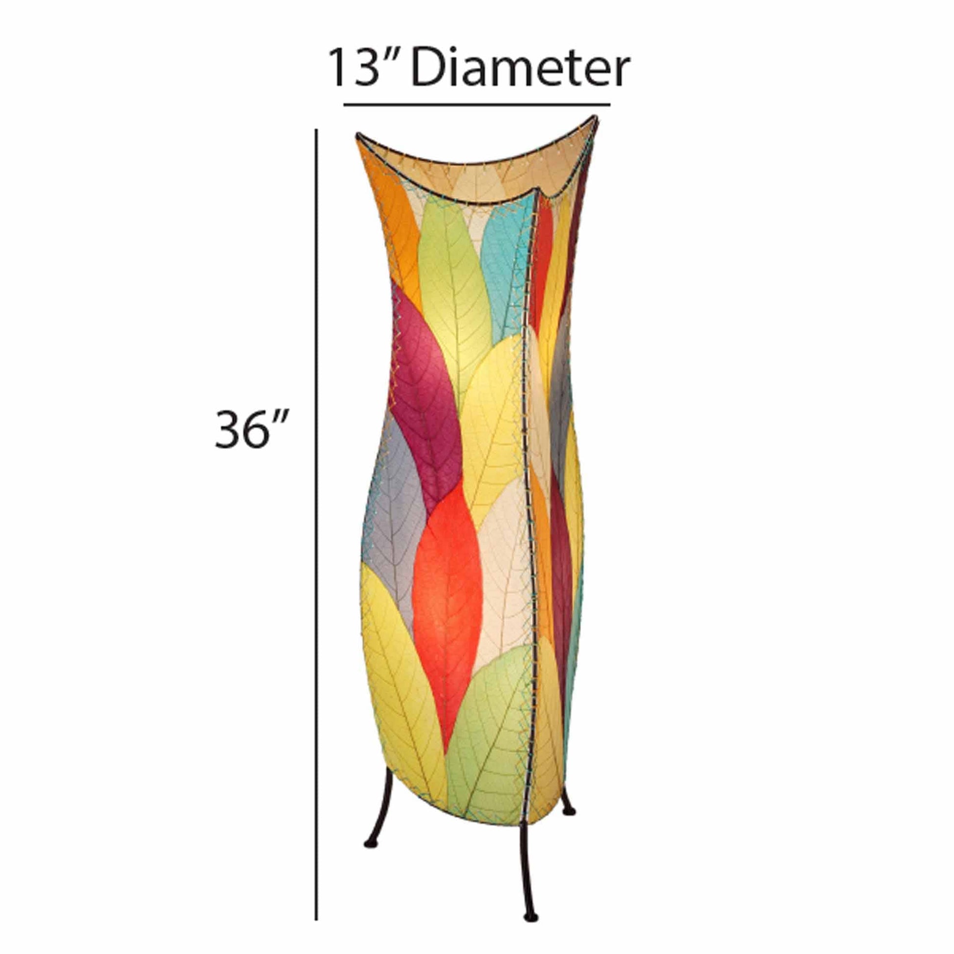 Features fossilized cocoa leaves arranged vertically that are hand placed on a standard UL lamp backing and then laminated using a non-toxic adhesive, creating the three side panels of the lamp. The panels are handstitched onto a powder coated, wrought iron frame to form a curved design. The upper interior of the lamp is finished with additional fossilized cocoa leaves.