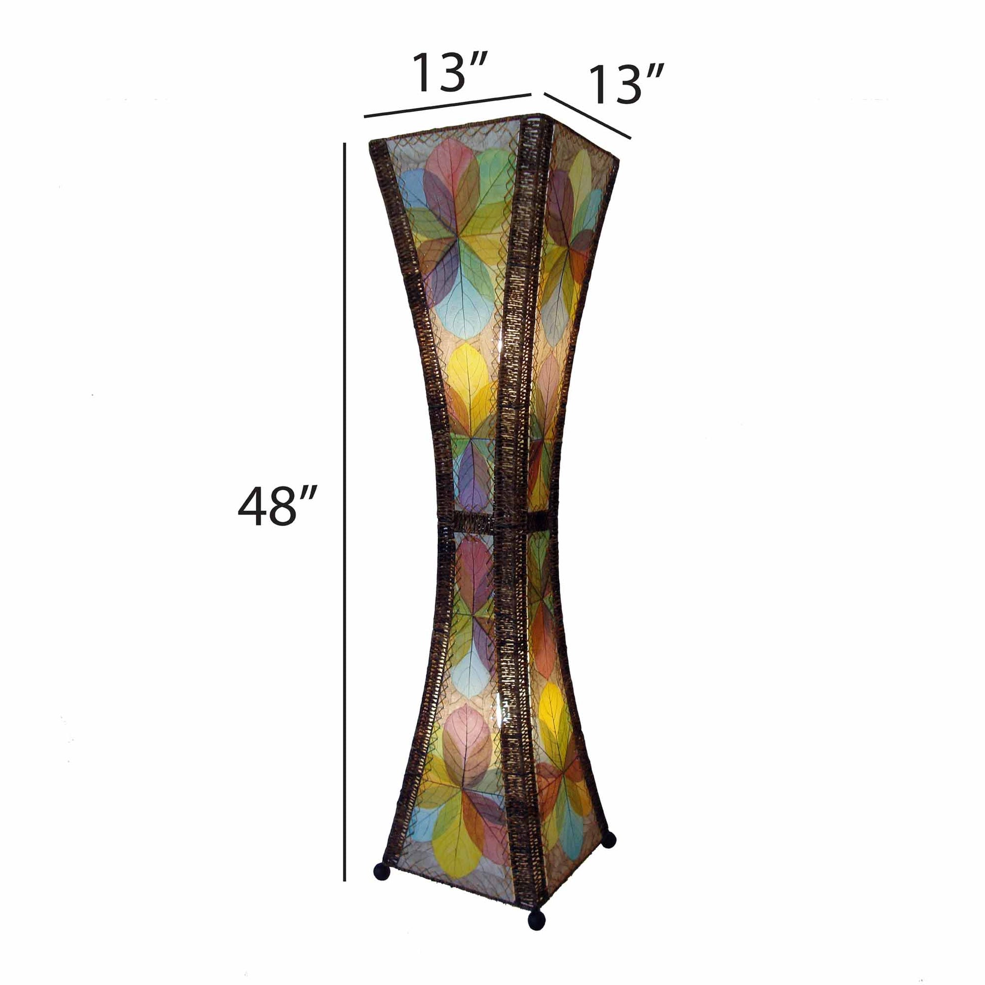 Features fossilized jackfruit leaves that are hand placed on a standard UL lamp backing and then laminated using a non-toxic adhesive, creating eight individual panels used on the lamp. The panels are handstitched onto a powder coated, wrought iron frame to form a traditional Hourglass design. The corners and center of the lamp are accented with a thin abaca rope which is woven around the metal framing. The body of the lamp is set on four wooden finials.