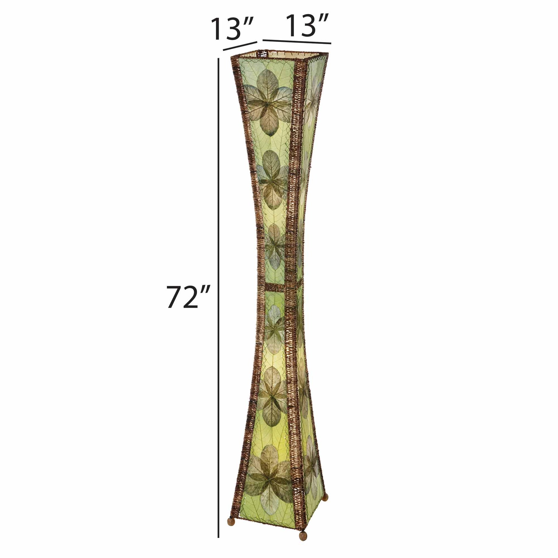 Features fossilized jackfruit leaves that are hand placed on a standard UL lamp backing and then laminated using a non-toxic adhesive, creating eight individual panels used on the lamp. The panels are handstitched onto a powder coated, wrought iron frame to form a traditional Hourglass design. The corners and center of the lamp are accented with a thin abaca rope which is woven around the metal framing. The body of the lamp is set on four wooden finials.