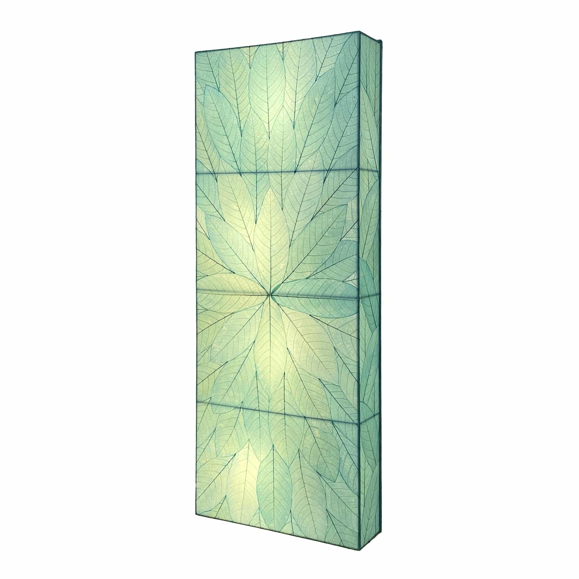 Features fossilized cocoa leaves that are hand placed on a standard UL lamp backing and then laminated. The panel is adhered onto a powder coated, wrought iron frame to form the rectangular shape. The sconce includes a five-foot cord, with plug, and an inline switch, but can be hardwired if desired. The sconce is hung with screws, included, and eyelets on the back of the lamp. It is designed to hang vertically or horizontally.