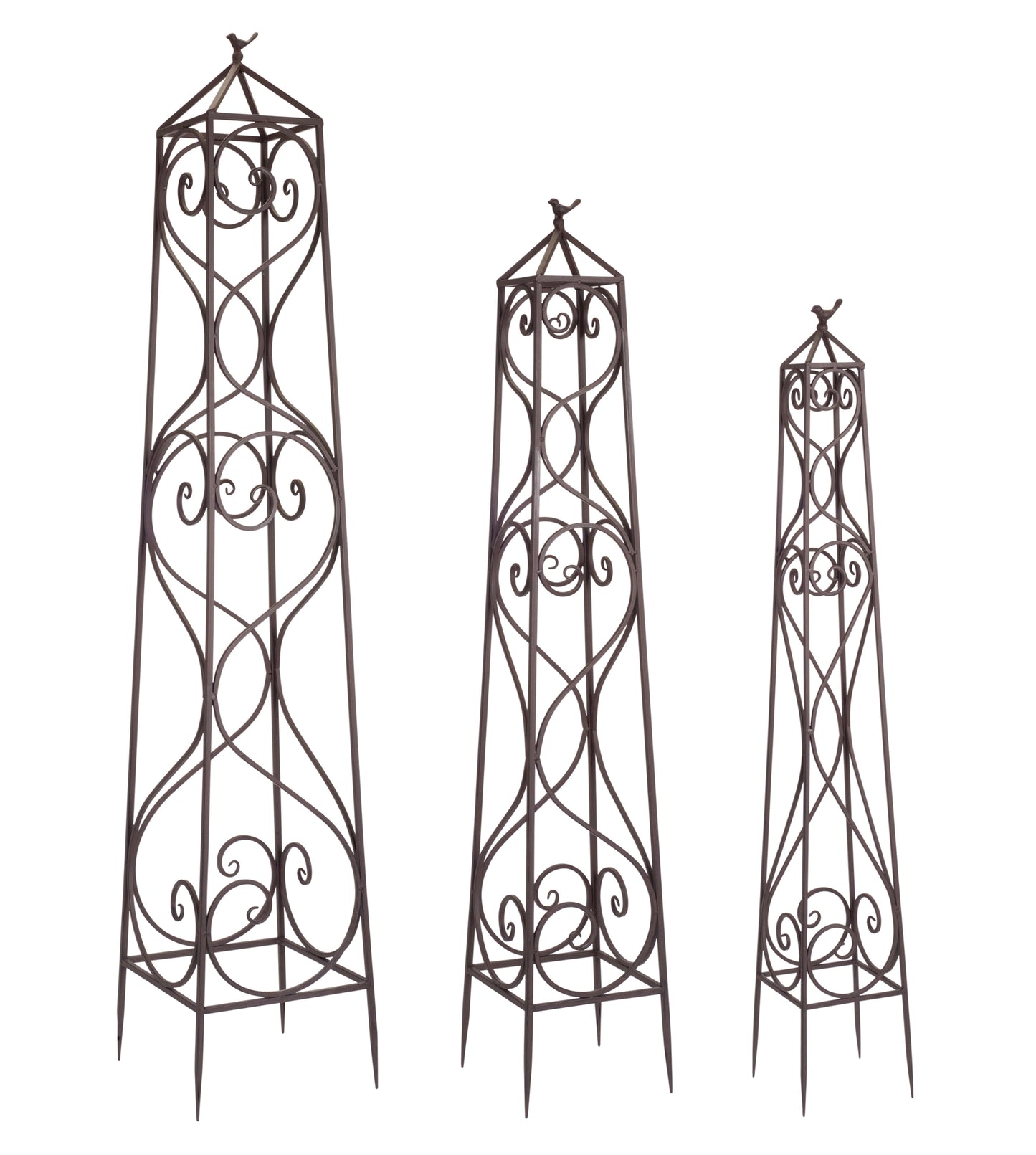 Set of 3 gorgeous Metal Trellises with a tapered shape. Styled with a bird atop the trapezoid tops and swirls of metalwork throughout the base. Measures 49, 55.5 and 66 inches in height. Perfect addition to your home and garden decor.