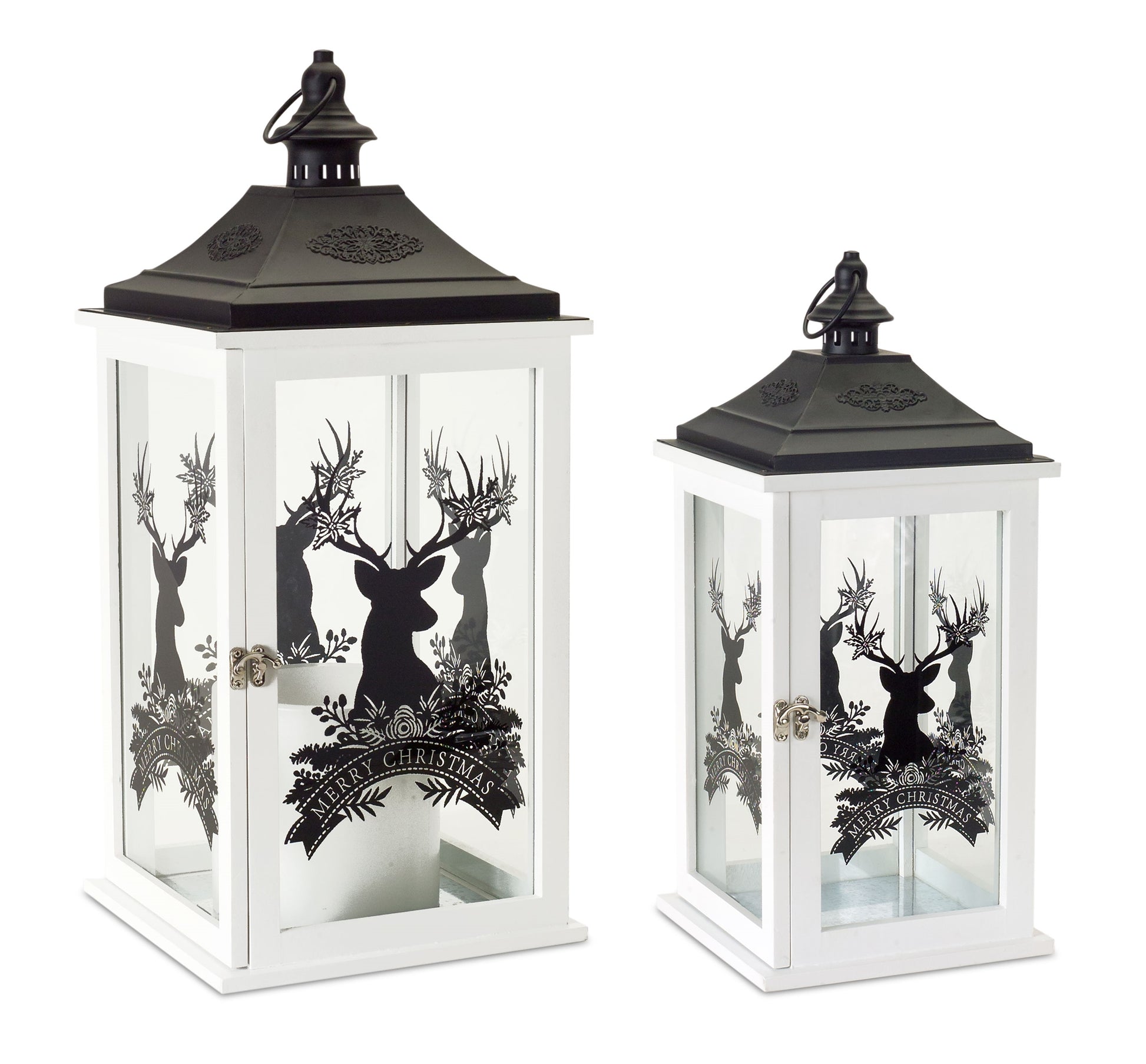 Our large lanterns in traditional black and white are spacious inside for adding candles and accessories. An artful deer and foliage design that includes a "MERRY CHRISTMAS" banner is on all of the glass panels while an embossed ornate design accents the black metal. The Merry Christmas Lanterns (Set of 2) is made of wood.
