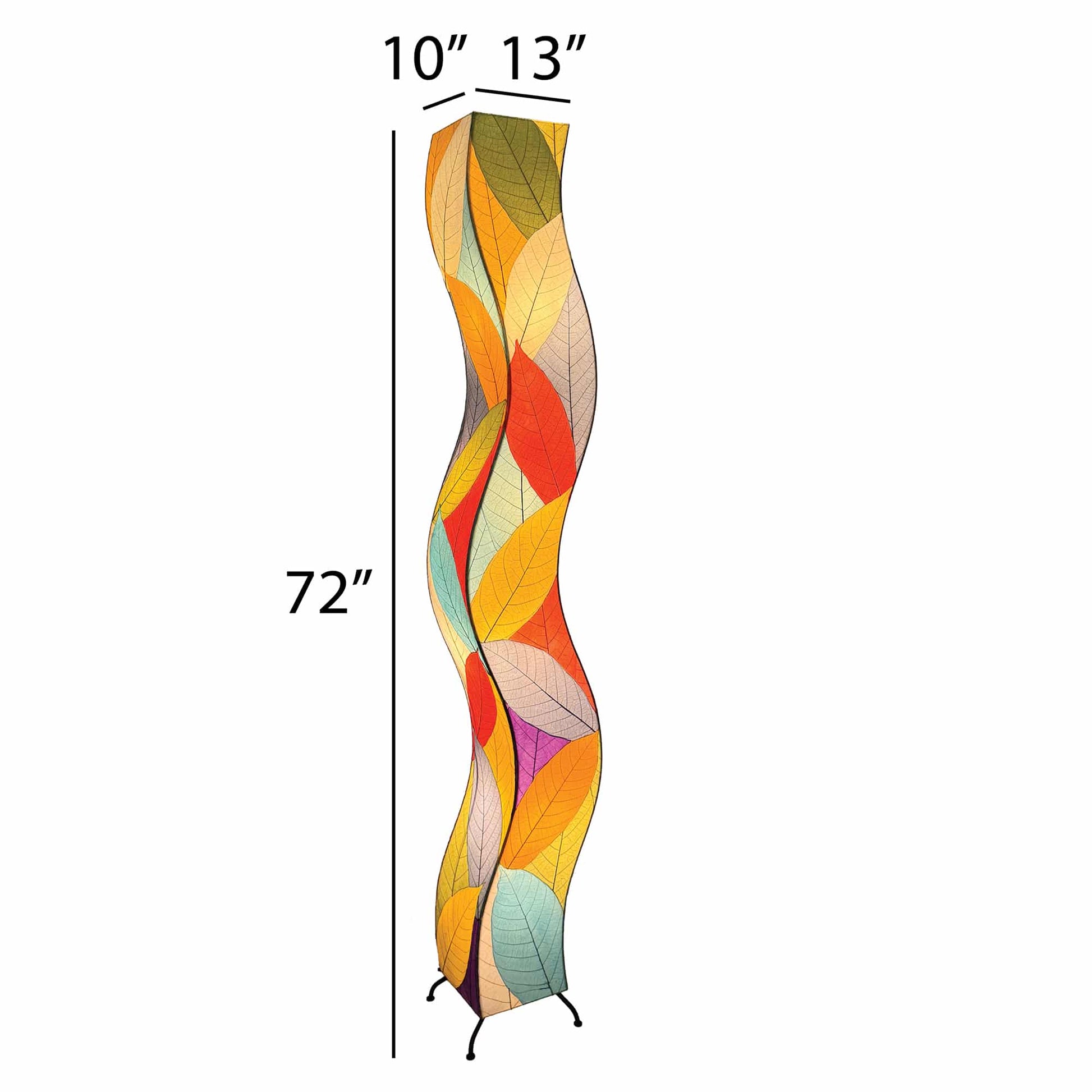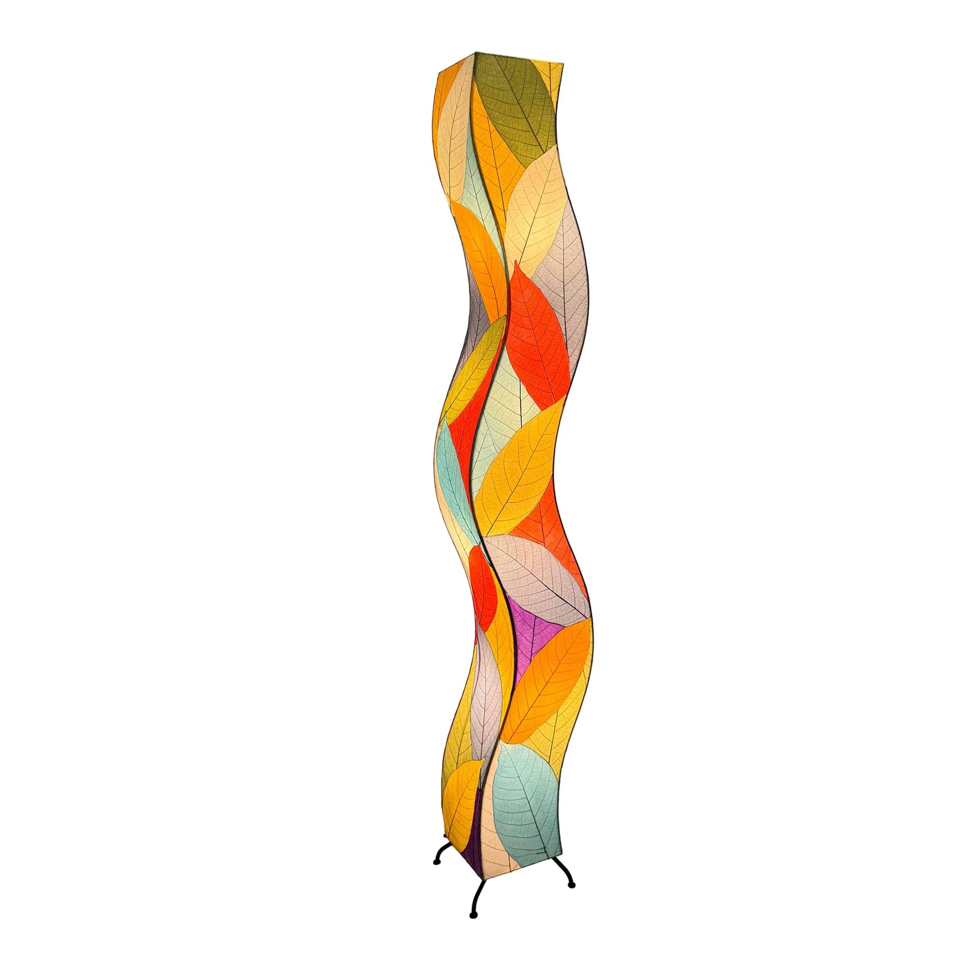 Transform your space with the Wrapped Wave Floor Lamp, a bold and artistic centerpiece that blends natural inspiration with modern craftsmanship. Towering at 72 inches, its organic, wave-like silhouette captures the movement and serenity of the ocean, while an intricate arrangement of real fossilized cocoa leaves creates a kaleidoscope of vibrant hues. Each leaf is carefully selected and layered, forming a dynamic, textured mosaic that comes alive when illuminated. Engineered for longevity, the lamp's durable wrought iron frame and using only four LED medium sized bulbs, ensure both style and practicality for years to come. Designed to fit seamlessly into a range of interiors, from eclectic to contemporary, this lamp brings energy, color, and a striking focal point to any space. Ethically handcrafted and eco-friendly, it's a celebration of sustainable artistry for the modern home.